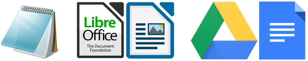 Os softwares usados podem ser o Bloco de Notas do sistema operacional, o LibreOffice Write para versão offline e local ou usar o Google Drive Documento.